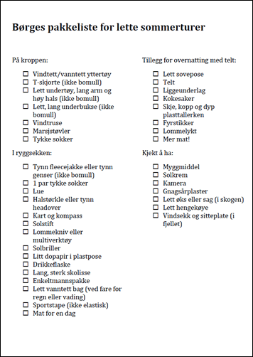 Pakkeliste for sommertur